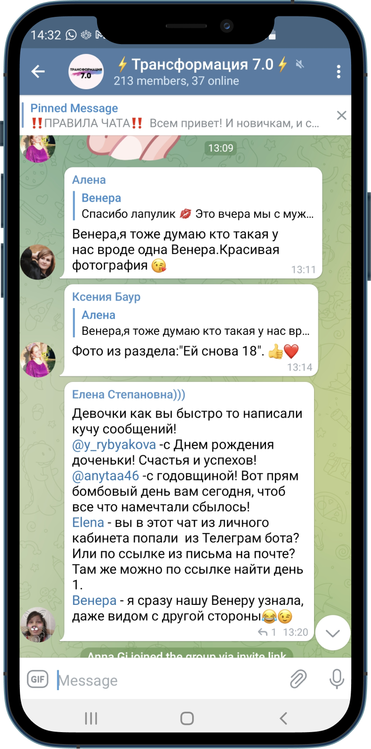 Чаты и каналы с окружением единомышленников, которые будут помогать идти к своей цели без срывов и откатов